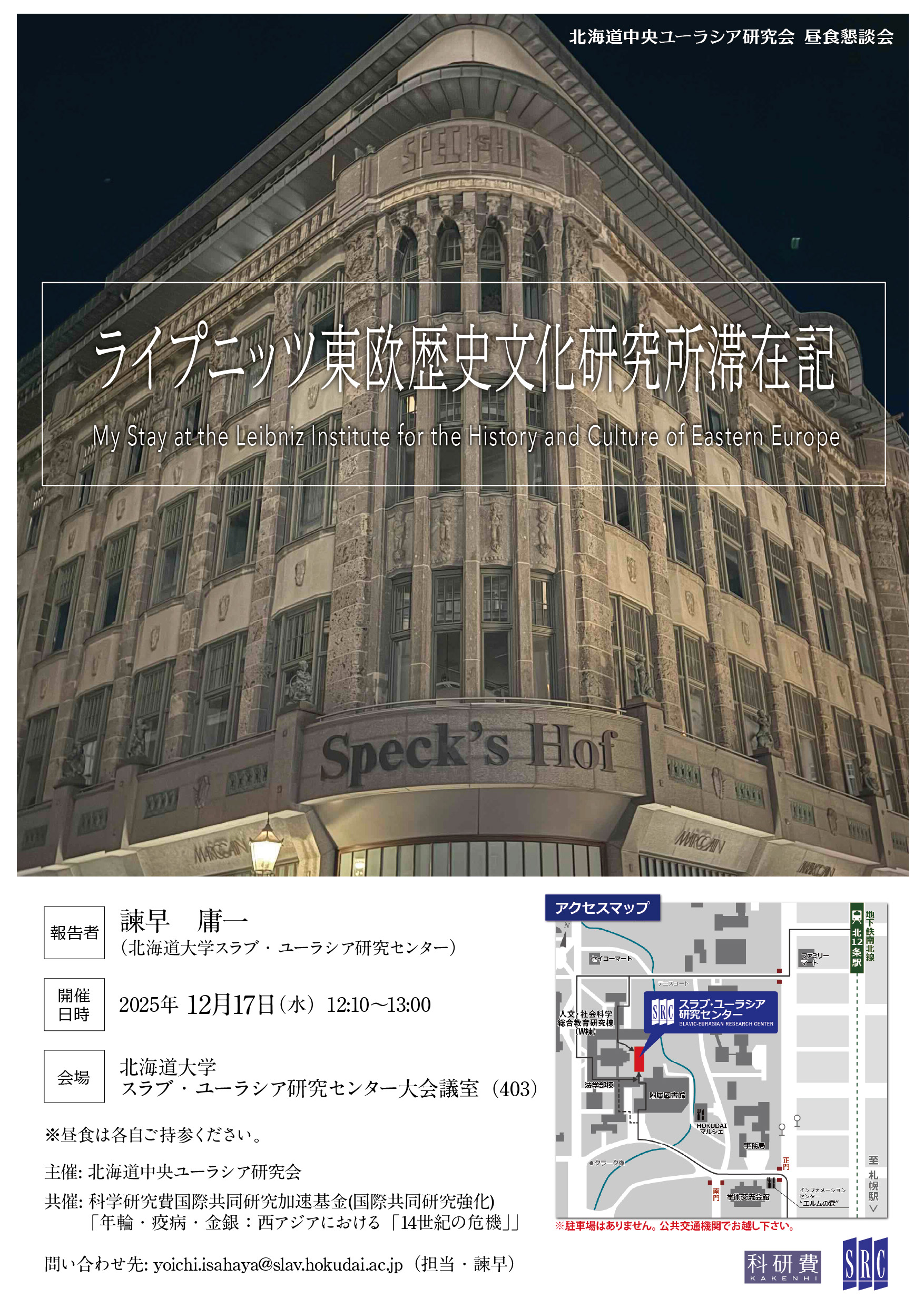 2025/11/27 「北海道中央ユーラシア研究会 昼食懇談会」のお知らせを掲載しました。 2025/11/19 「北海道中央ユーラシア研究会第152回例会」のお知らせを掲載しました。 2025/06/10 「北海道中央ユーラシア研究会第151回例会」のお知らせを掲載しました。
